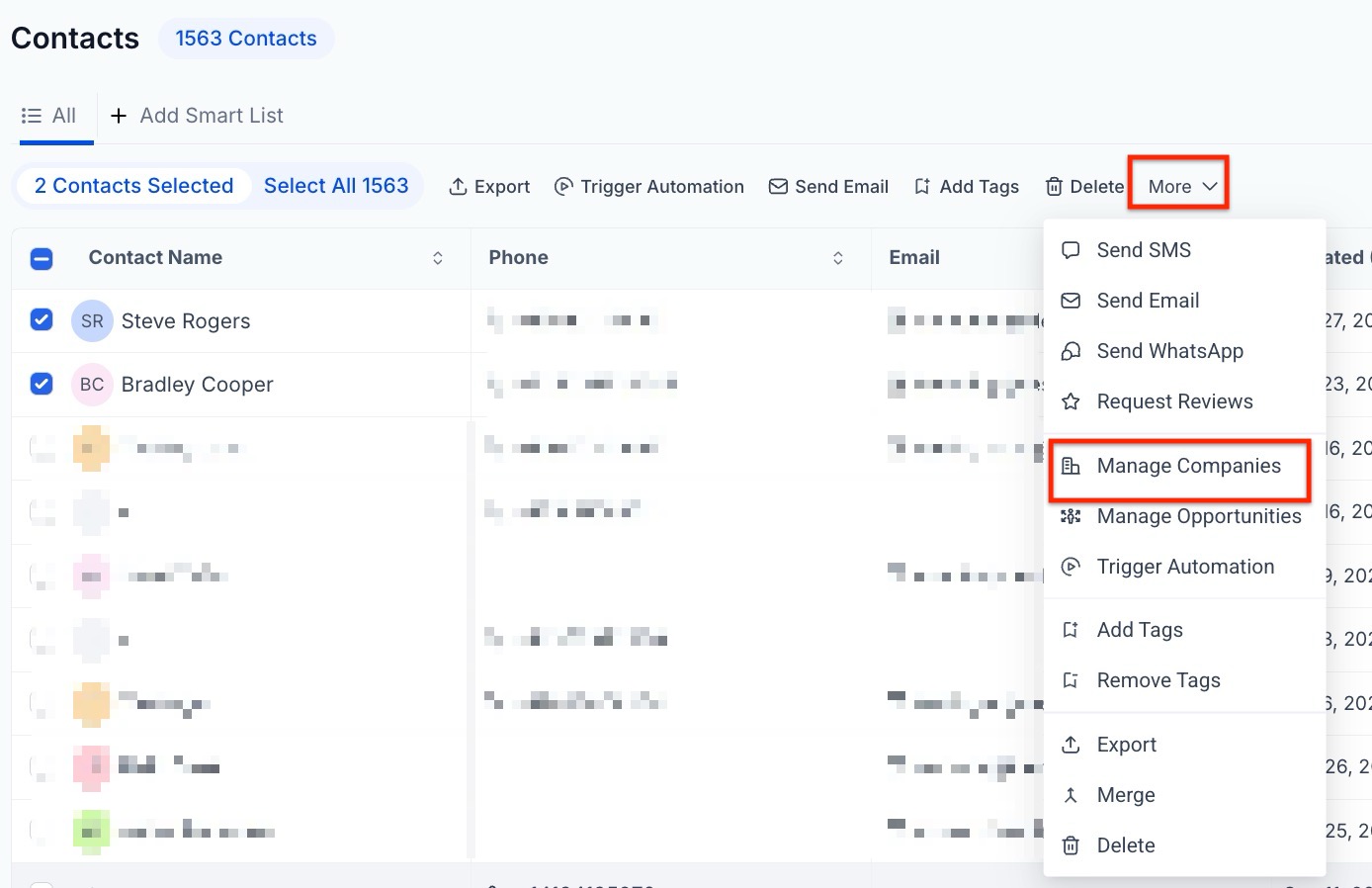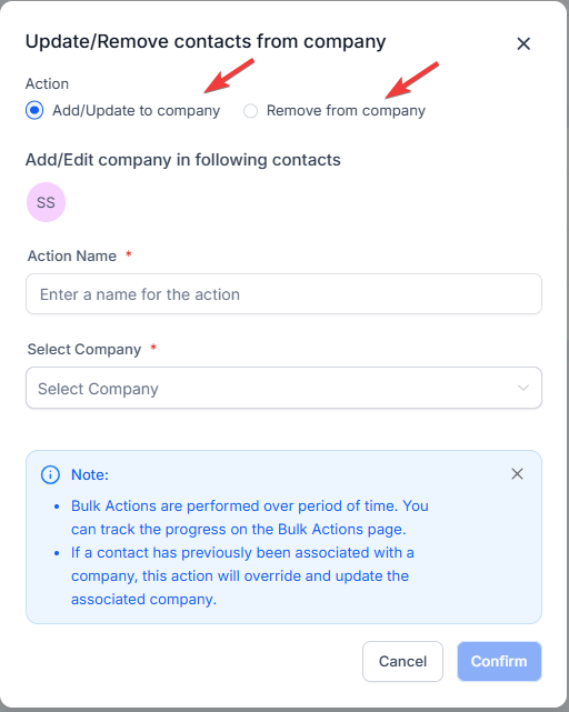 Answer: In the Contacts/Smart Lists section, you can bulk add, remove, or edit contacts associated with a company. Simply select the contacts, choose the “Add/Edit to Company” option, select the action you want to perform, and apply it to the chosen company.