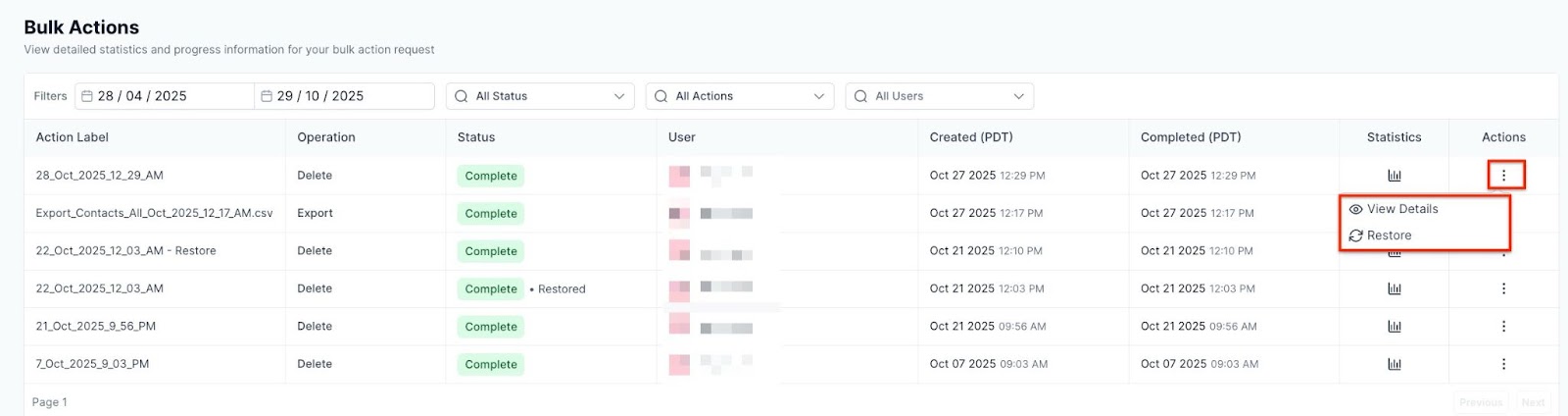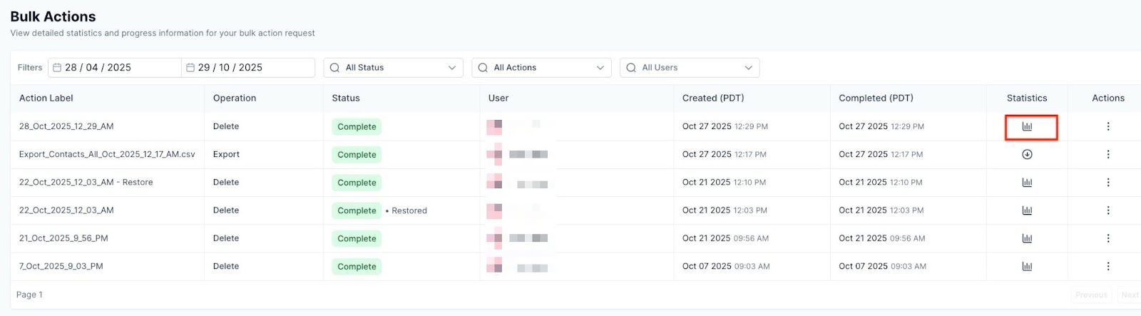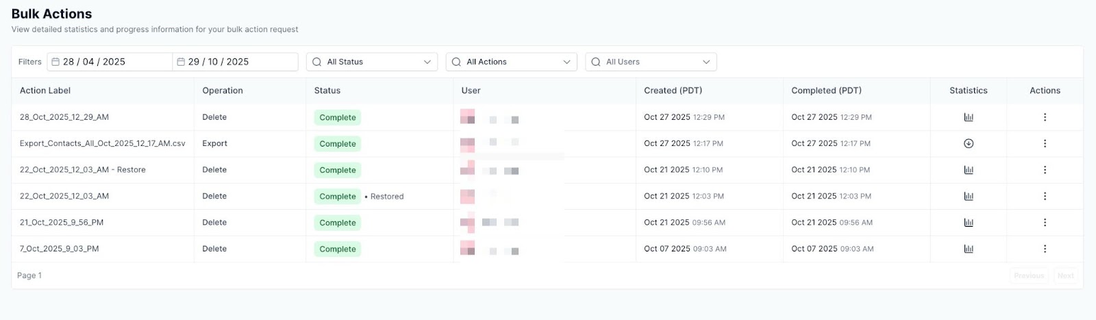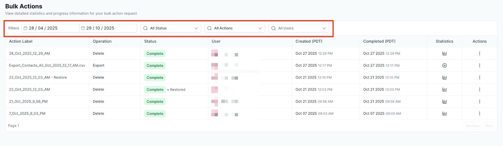 - Use advanced filtering to search bulk actions by action type, status, users, and date range. Filtered views can be easily shared via URL for quick access.
