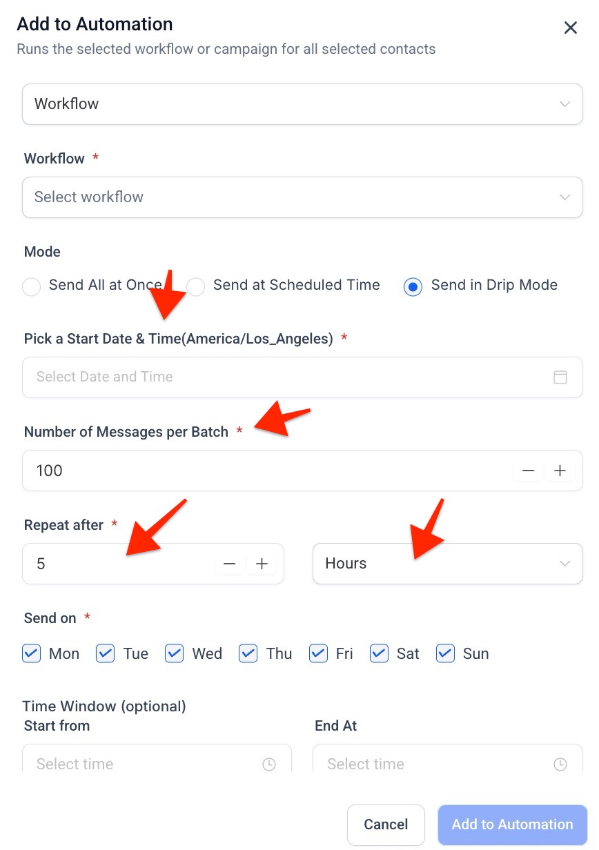 Answer: Yes, you can schedule a Bulk Action in drip mode. When doing so, the “repeat after” option functions as “run every.” For example, if you set it to process 100 contacts every 5 hours, it will continue in batches until all selected contacts have been processed.
