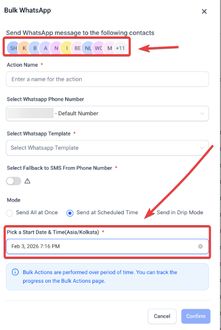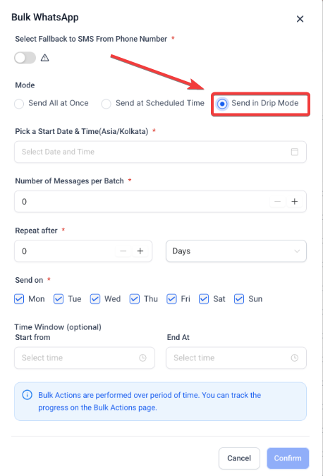 Step 3: Choose the drip delivery option to send your messages in small groups, set your preferred timing and batch sizes, then simply confirm and track the progress from your bulk actions.