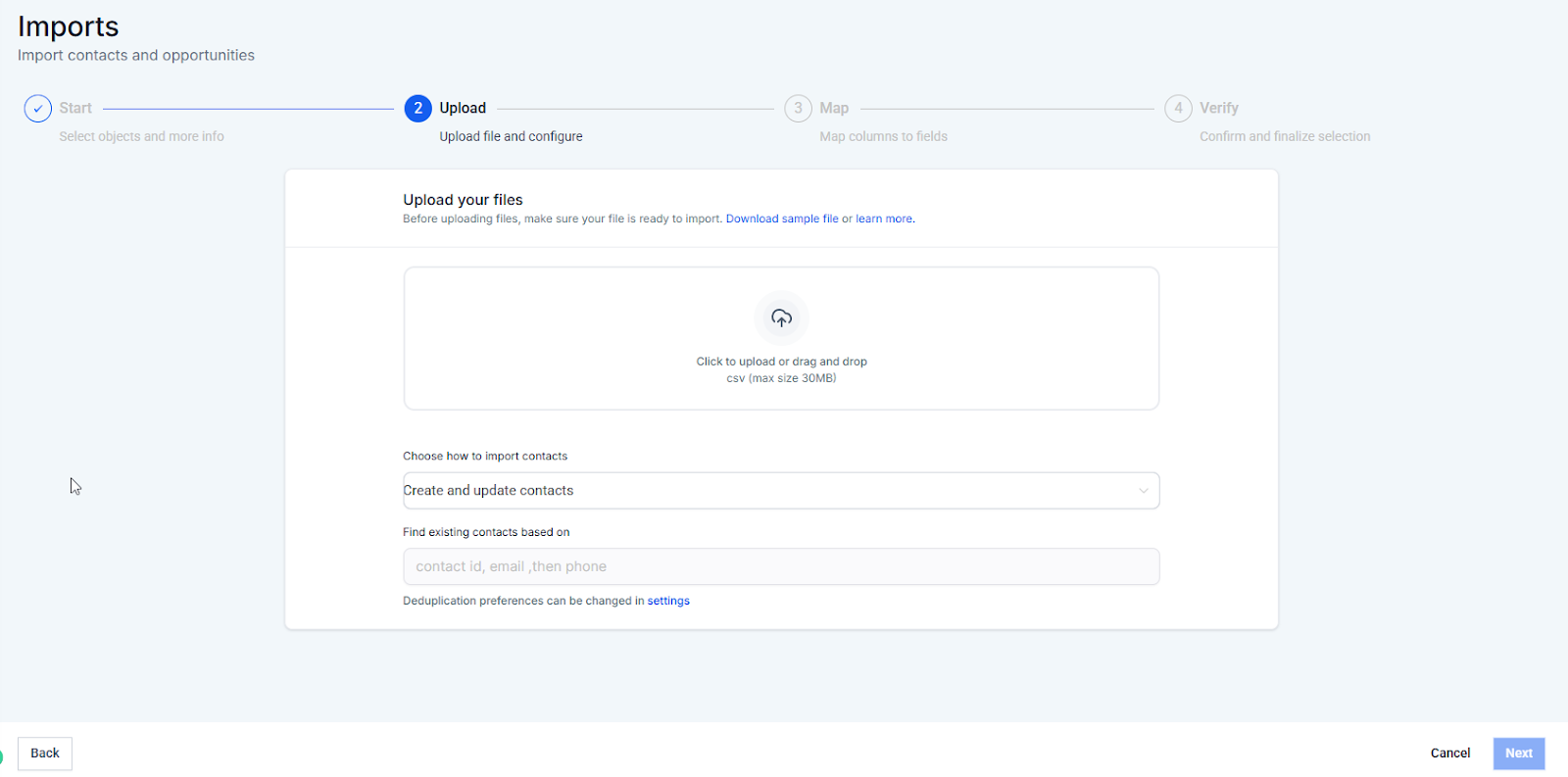 Answer: You can choose to add new contacts, update existing contacts, or do both. You can also select primary and secondary methods to identify existing contacts.