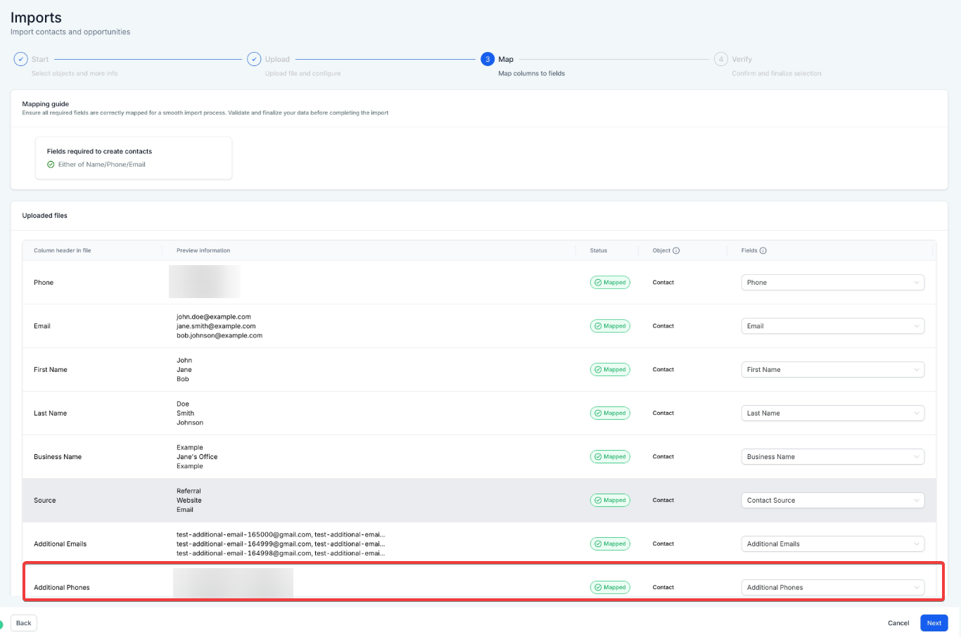 Map the .csv fields to system fields, using the "Additional Phones" field for secondary and other numbers. Ensure numbers are separated by commas, slashes, or semicolons.