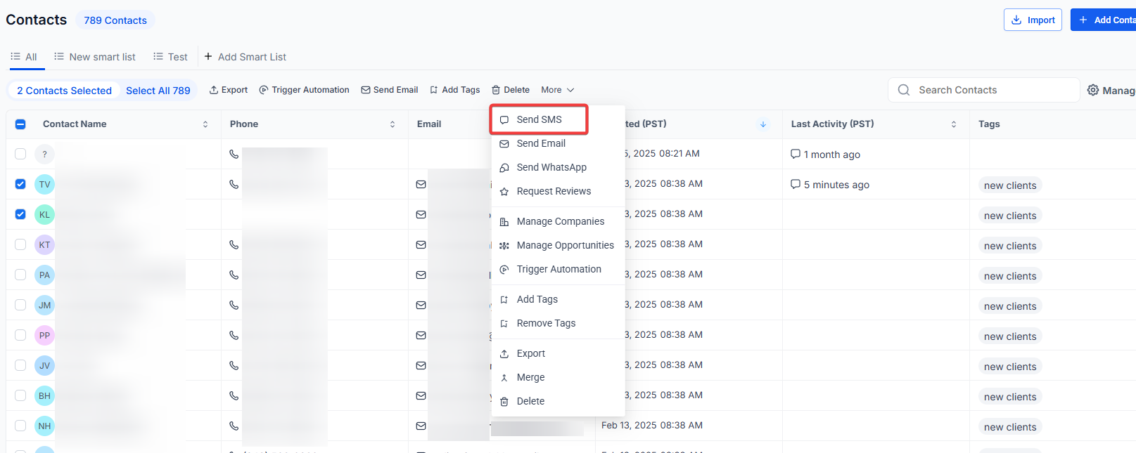 Bulk actions are a convenient way to take action for a group of contacts. After selecting a group of contacts or selecting a smart list you can send them emails, send SMS, and add them to workflows. In this article, we will go over the delivery options when taking these actions.
