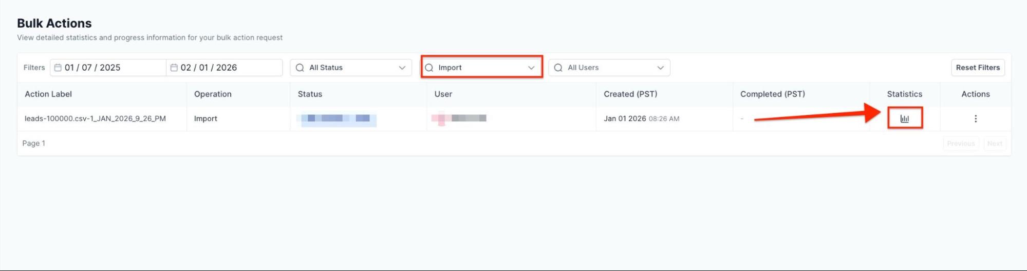 - Next to your Bulk Import operation, click on Statistics.