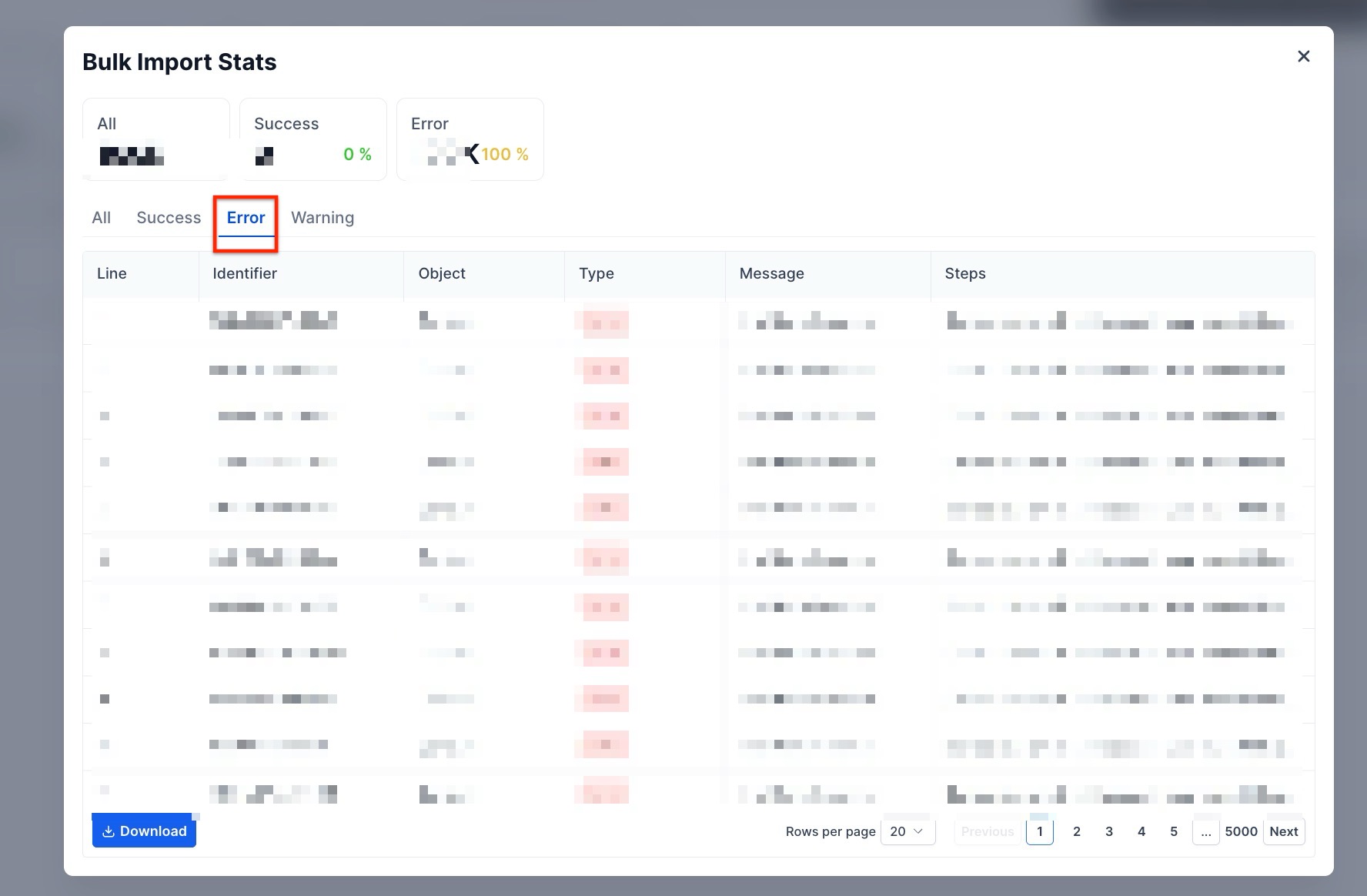 Answer: To view errors, go to Contacts > Bulk Actions and click on Statistics next to your import operation. From there, select the Error tab to see a detailed list of what went wrong.