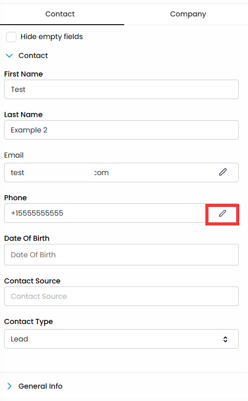 - Once you have the contact open, find the Phone number section and select the pencil icon:
