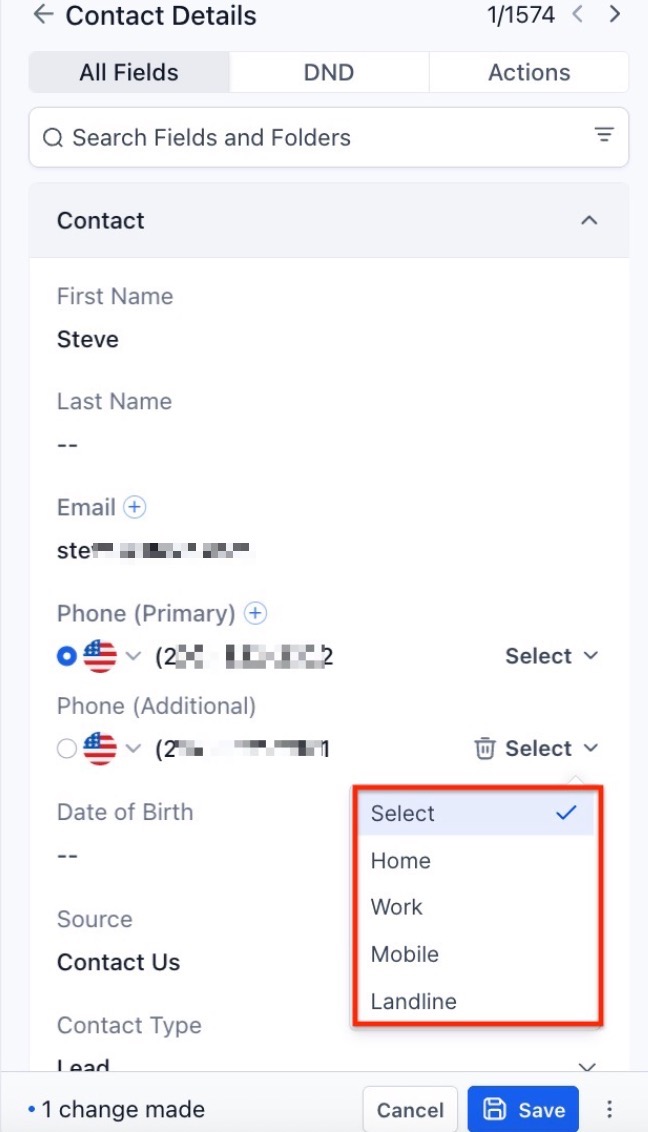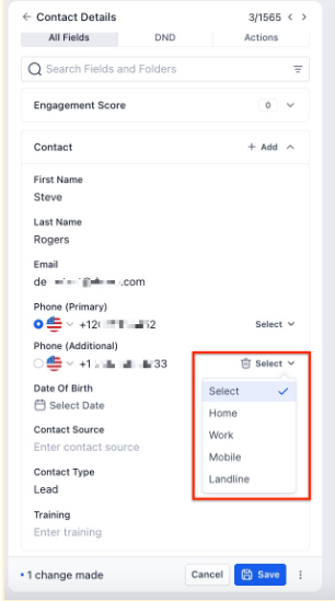 - Use the dropdown menu to select from the available labels: Home, Landline, Mobile, and Work. Note that each label can be selected only once per contact.