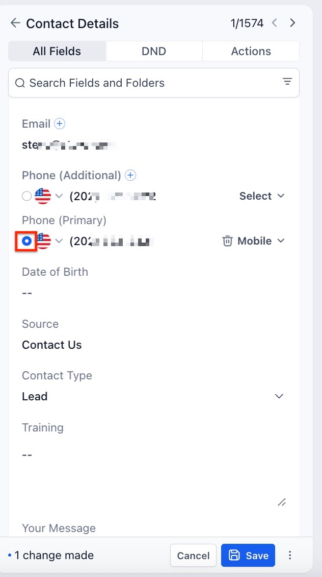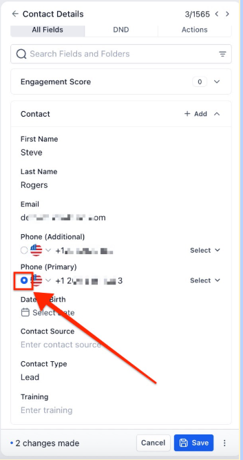 - After adding, select the number you wish to mark as primary by clicking on the radio button next to it.