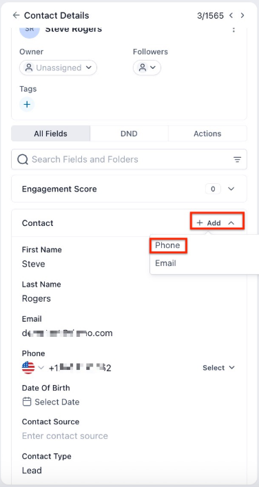 - Find where it says ‘Add’, click that and select ‘Phone’ from the drop-down’.