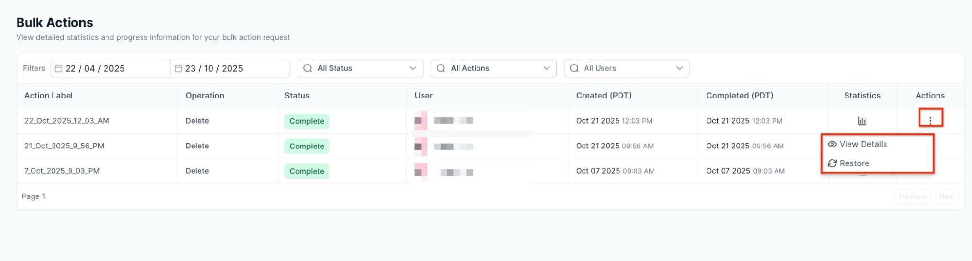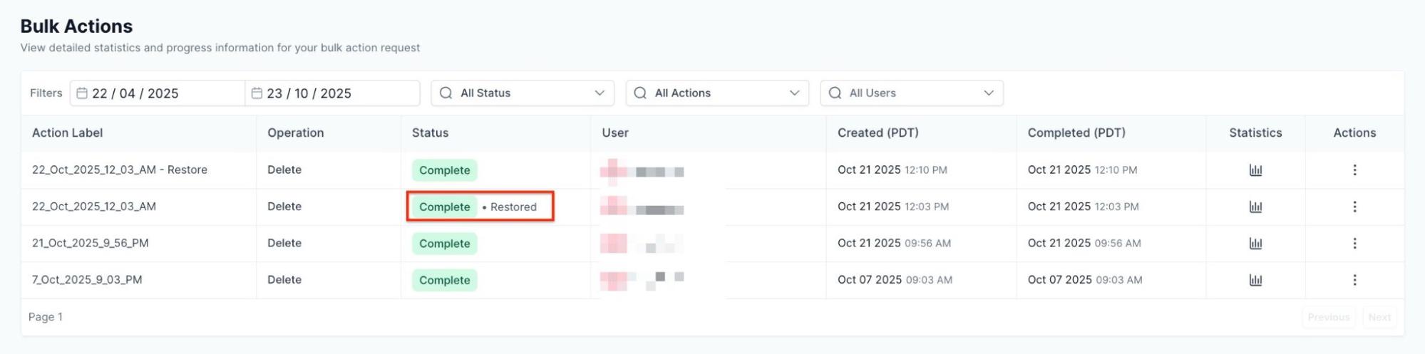 Answer: Once the restoration process is finished, you will see the Status for that bulk action marked as “Complete” within the Bulk Actions menu.