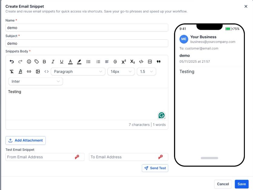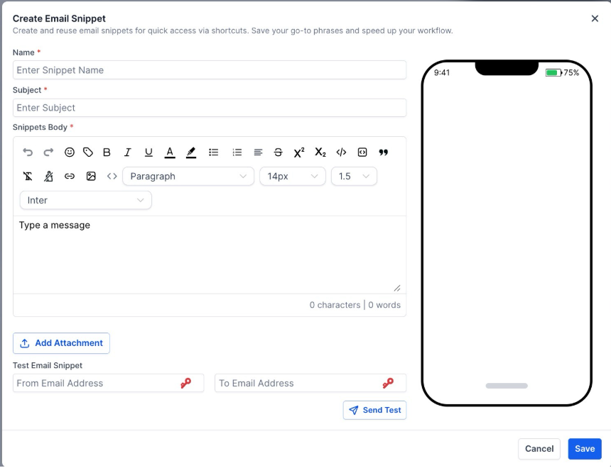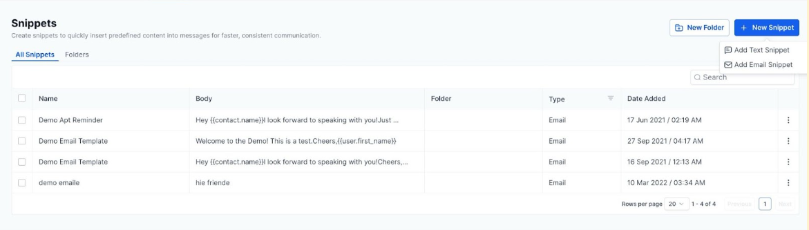SMS and Email snippets are saved draft templates that you can directly add to your workflow actions or one-time communications. This is useful if you often find yourself sending the same or similar messages (and you don't want to utilize the Email Builder), as using the templates can save you time.