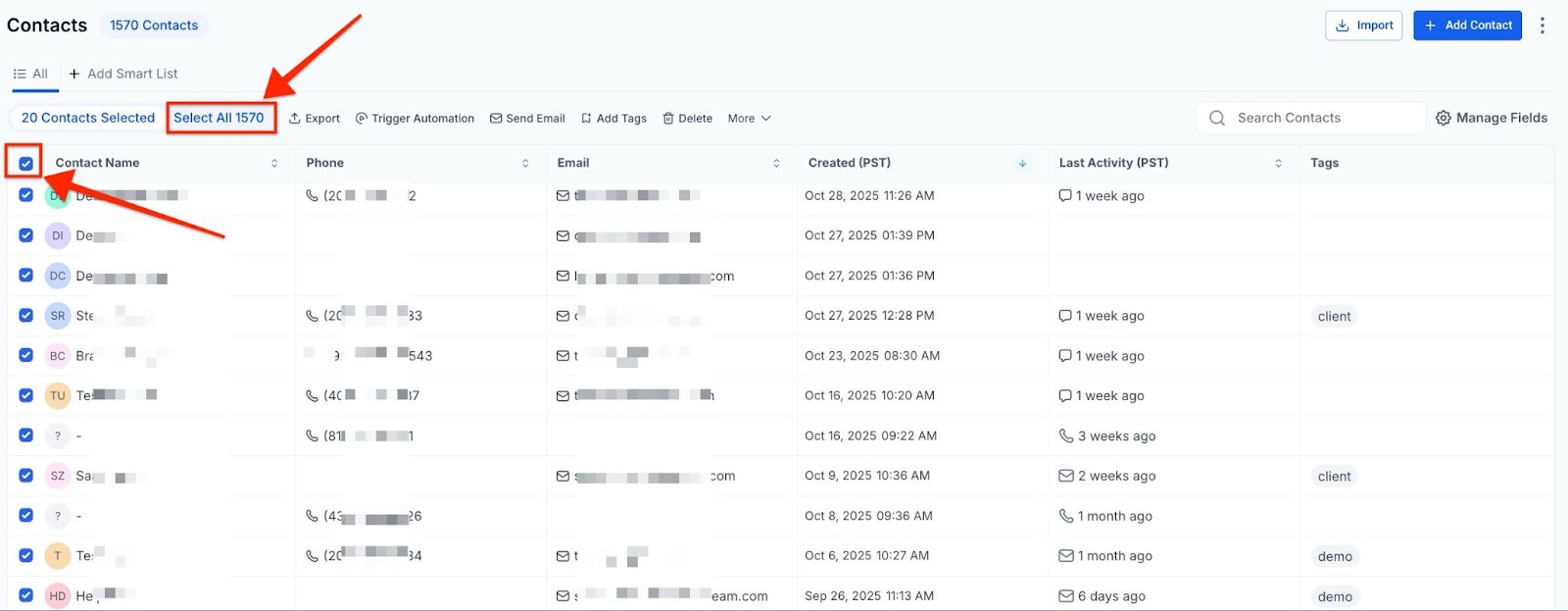 - To select all contacts on the current page, check the box at the top of the page.