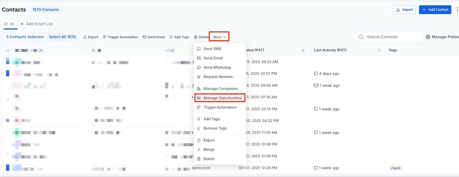 Answer: Yes, using the Manage Opportunities bulk action, you can add or update pipeline stages, opportunity statuses, lead values, and more for selected or all contacts.