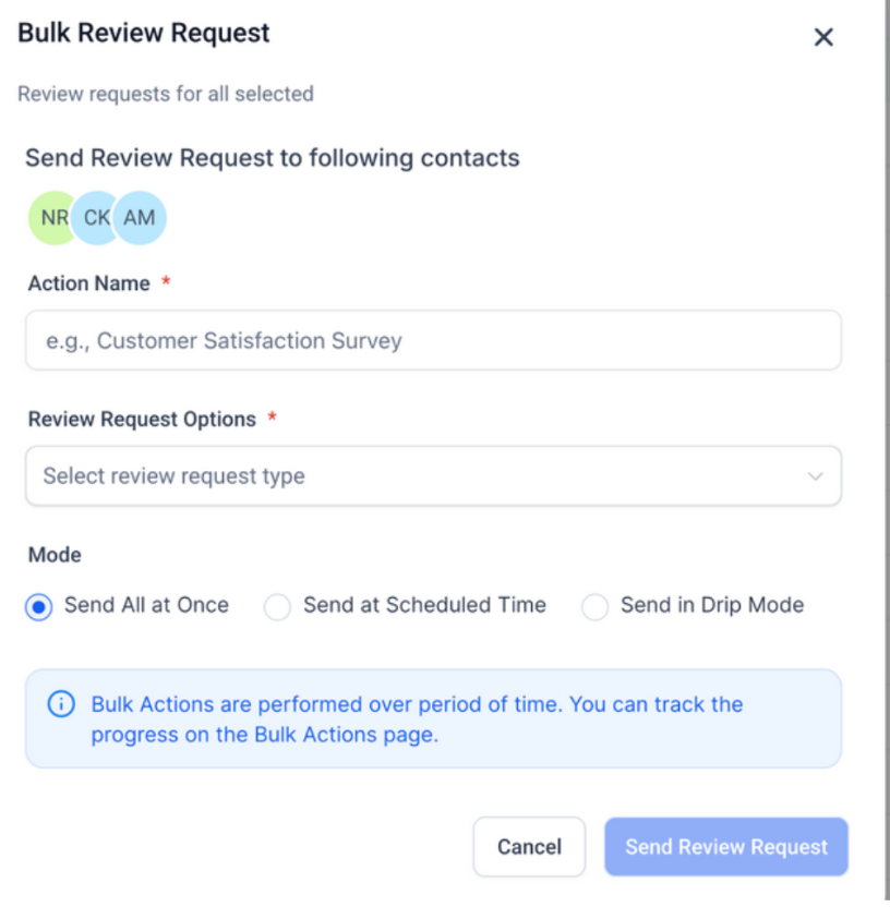 Note: To send bulk review requests, you need to have admin privileges, Account users cannot send bulk review requests, only account admins can. If you are an account user, please reach out to your account admin.