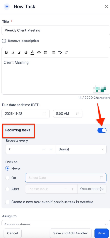 2. Toggle on the Recurring Task option and configure: