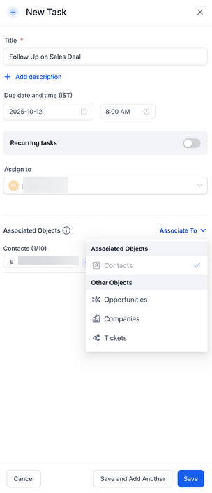 - Multi-Object Task Associations: The task system lets you link one task to multiple records like Contacts, Opportunities, Companies, and Custom Objects supporting a more efficient, collaborative workflow across teams.