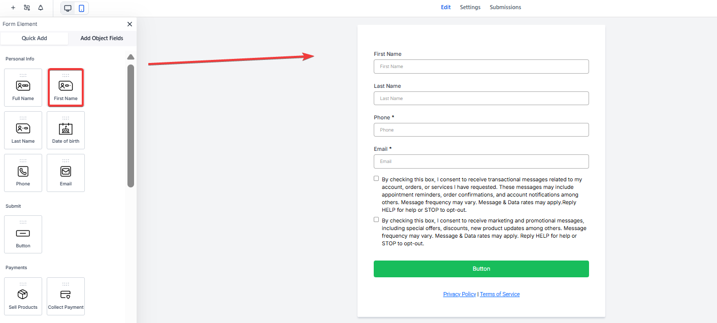 1. Add the Payments Element: Drag the Payments element into your form.