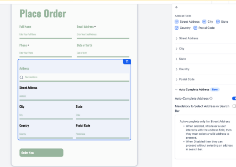 Address Auto-Complete makes it easier for users to enter accurate addresses by showing real-time suggestions and auto-filling fields like street, city, state, postal code, and country. This speeds up submissions, reduces errors, and improves data consistency. Just add the Address field in your form and toggle on Auto-Complete.