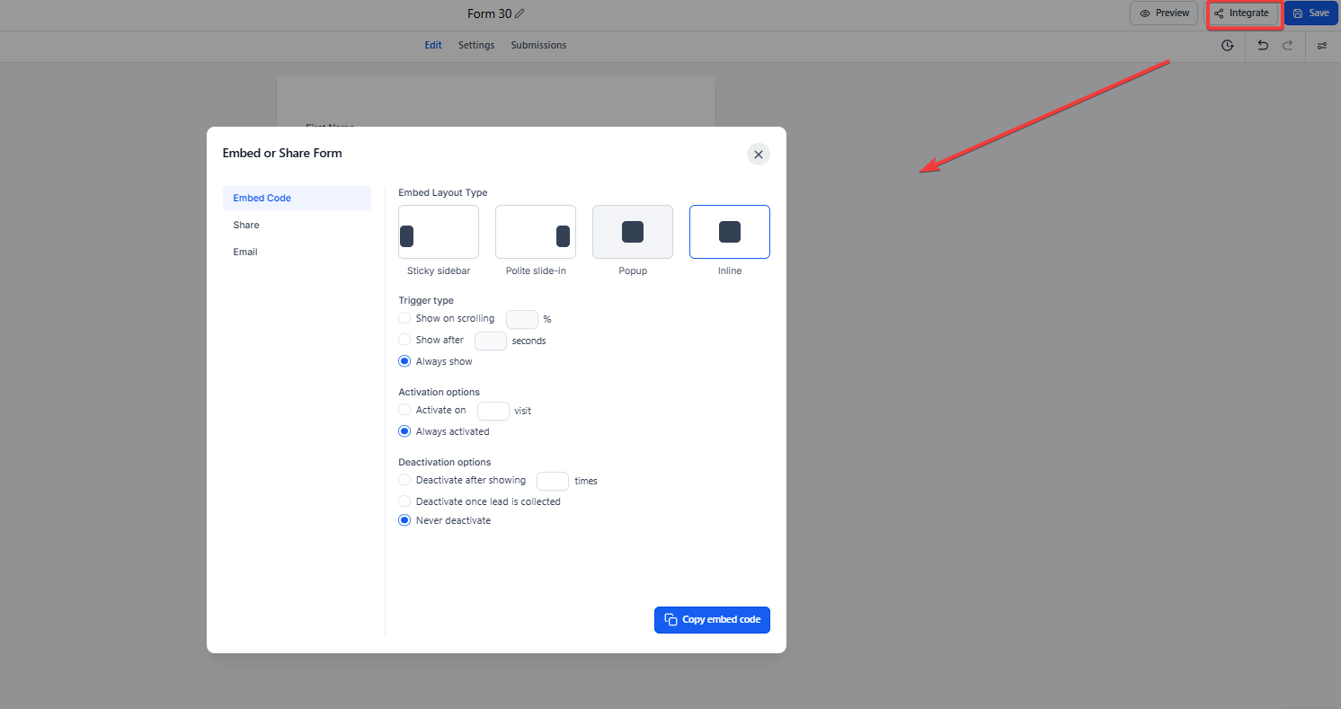 - Once you create a form and save any changes, you can click “Integrate Form” to access a link or embed code.