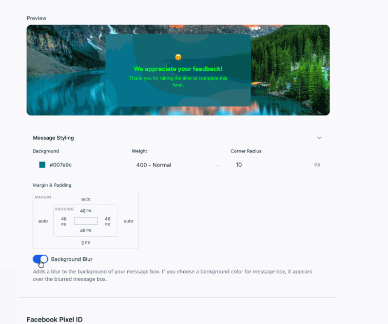 Navigate to On Submit → Message Styling. Use the rich text editor to craft your message, toggle between Desktop and Mobile layouts to adjust styles, and enable “Background Blur” or set custom background colors as desired.
