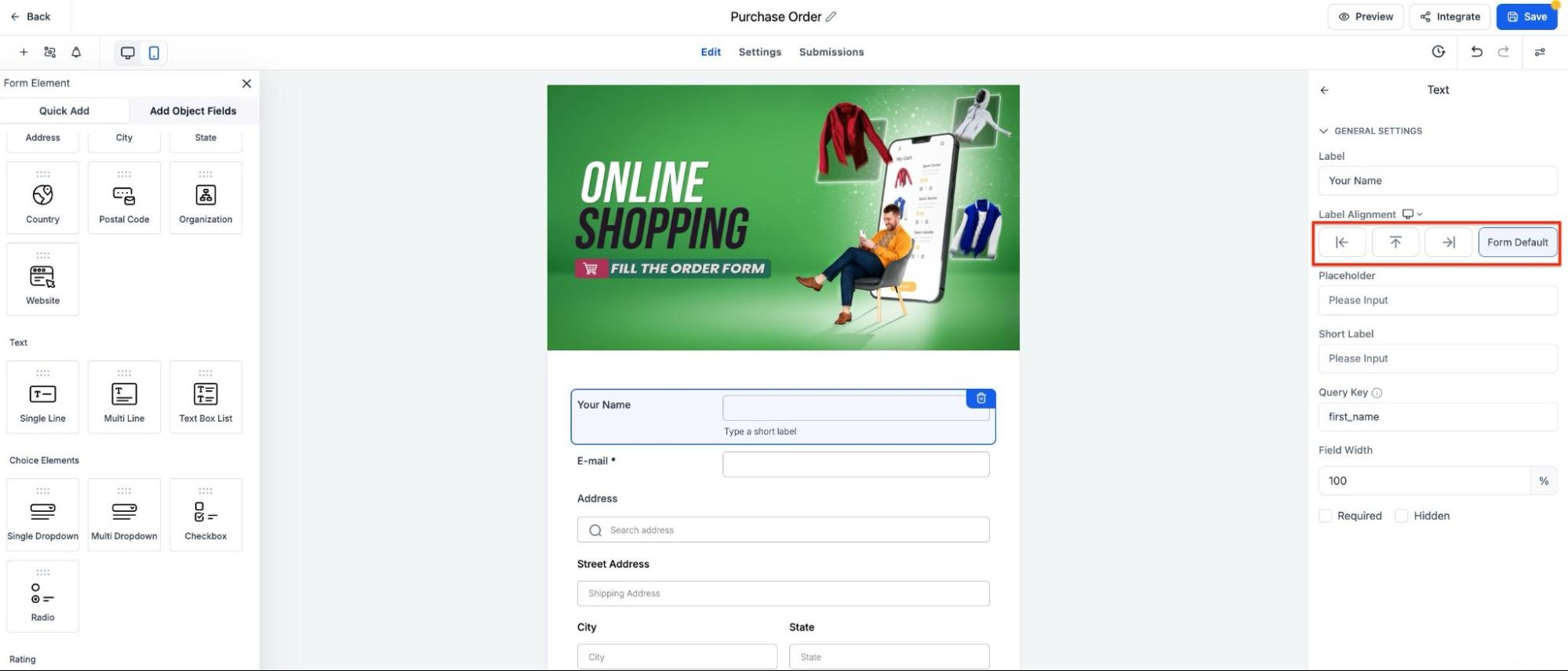 - The Inline Editing feature allows users to edit text elements directly within the builder preview. You can click, type, and instantly update text elements like labels, placeholders, options, and buttons. Click on any text element in the builder, edit it directly, and see your changes reflected instantly.