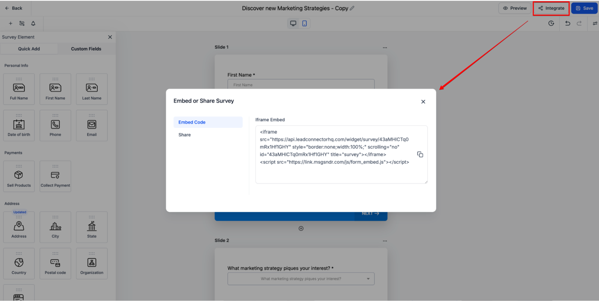 - Once you create a survey and save any changes, you can click “Integrate Survey” to access a link or embed code. Embed code can be included in a website or funnel page. A link can be pasted into an SMS or email message.