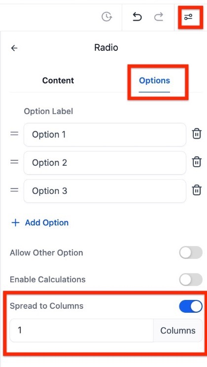 The Spread to Columns feature for surveys allows the configuration of multiple columns for radio buttons, radio images, and checkboxes. Select the radio buttons or checkboxes, and adjust the column settings in the right-hand menu. This feature applies to new surveys and does not affect existing ones.