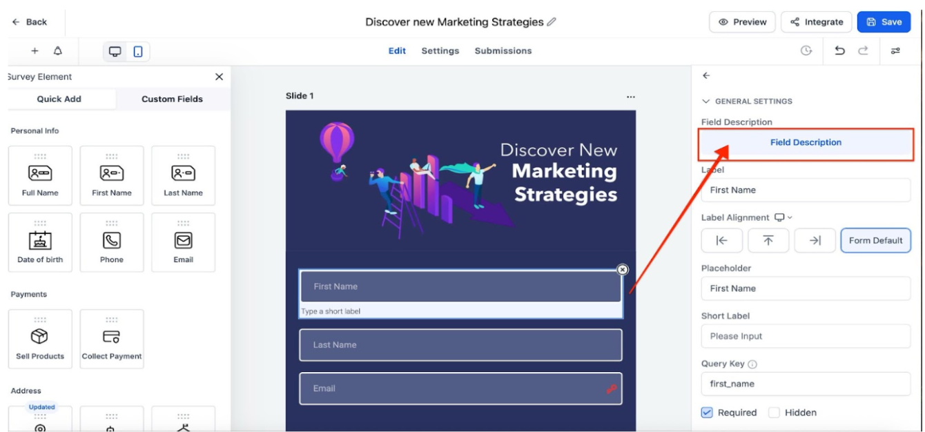 - Click on each field to edit the field label, placeholder, and query key, and to mark it as required or hide it.