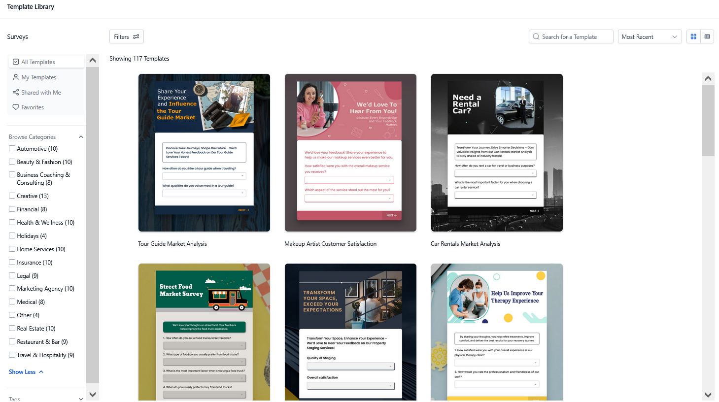 - Choose a survey template by filtering for a specific category, click on the template you like, and then click on the “Continue” Button.