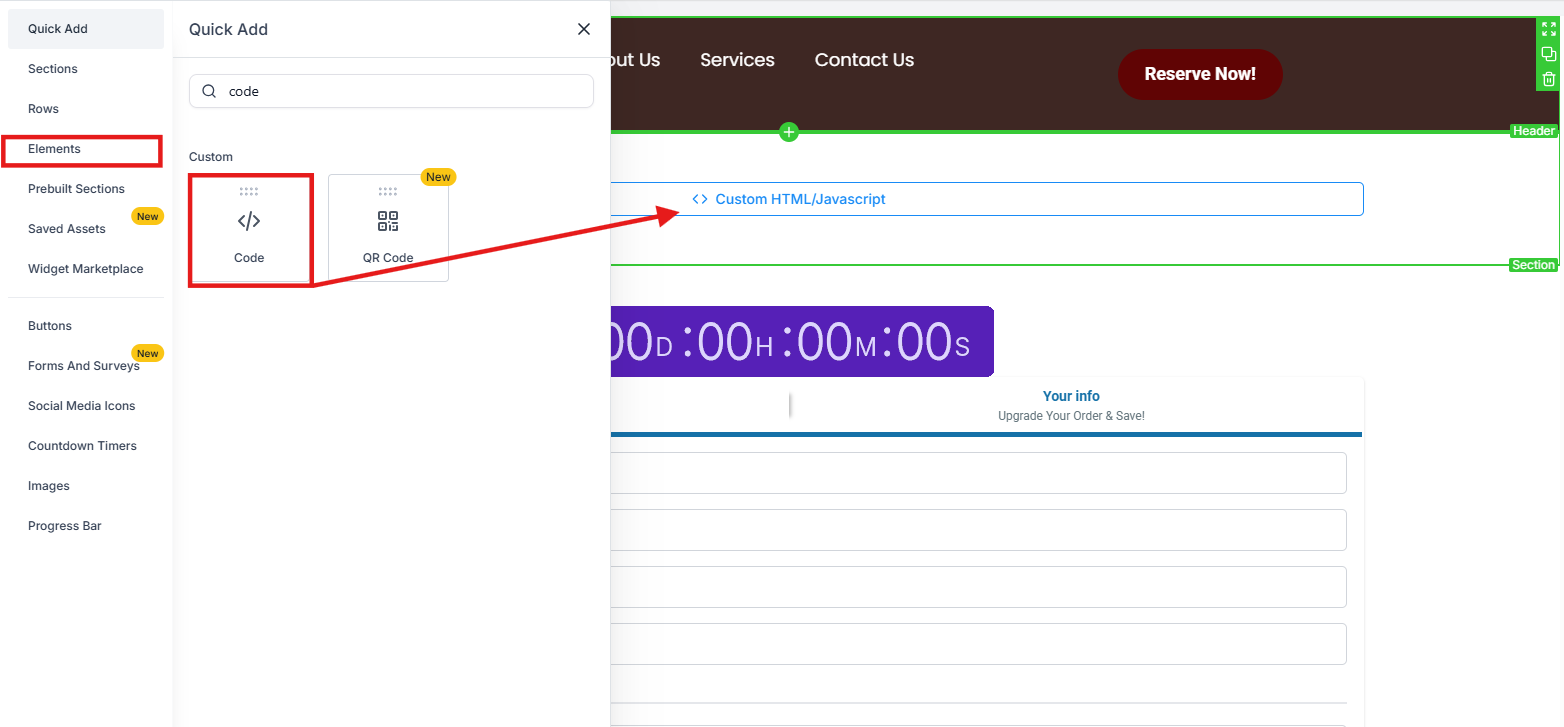 - Go to the funnel or website page editor where you want this pop-up to be, and add a Code element (also known as Custom HTML/Javascript element)