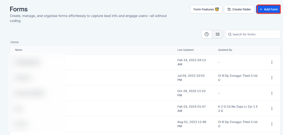 - For a new form, click on "+ Add Form". If you wish to update an existing form, select the form you want to edit.