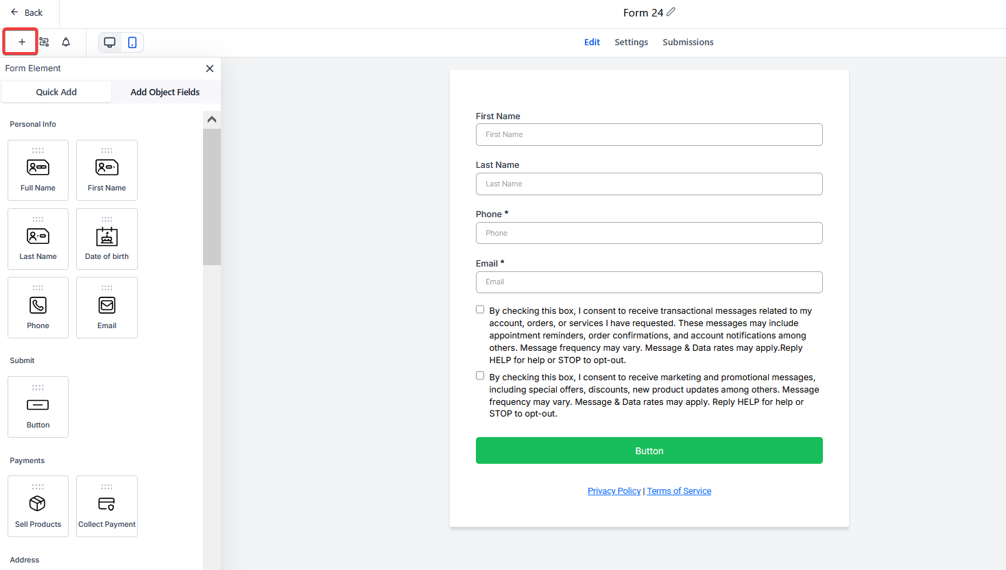 - Find the "Add Form Element” option in the form builder.