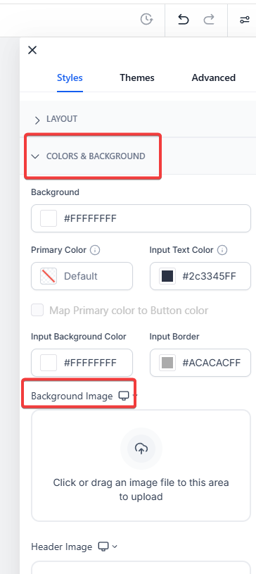 - Scroll down in the menu to Colors and Background, click on the upload area, or drag an image file to this space to add a background image of your choice. The image will cover the entire page background, enhancing the form's visual allure.