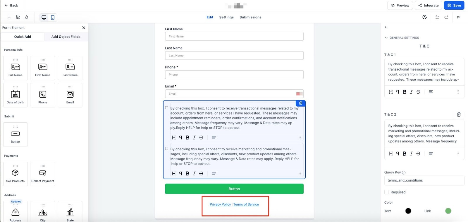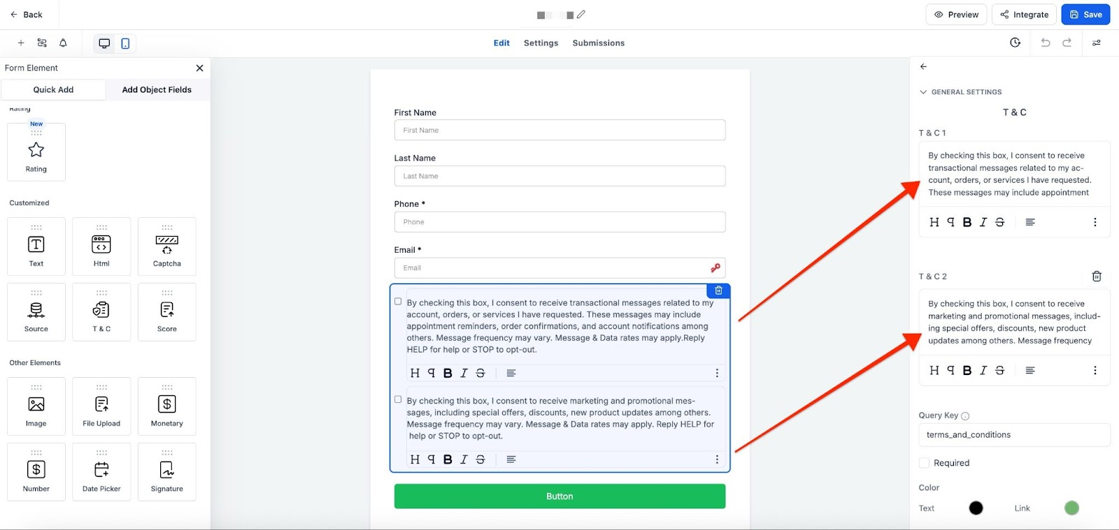 A: You can edit both the Transactional and Promotional T&C text directly in the form editor to meet your business and compliance requirements.