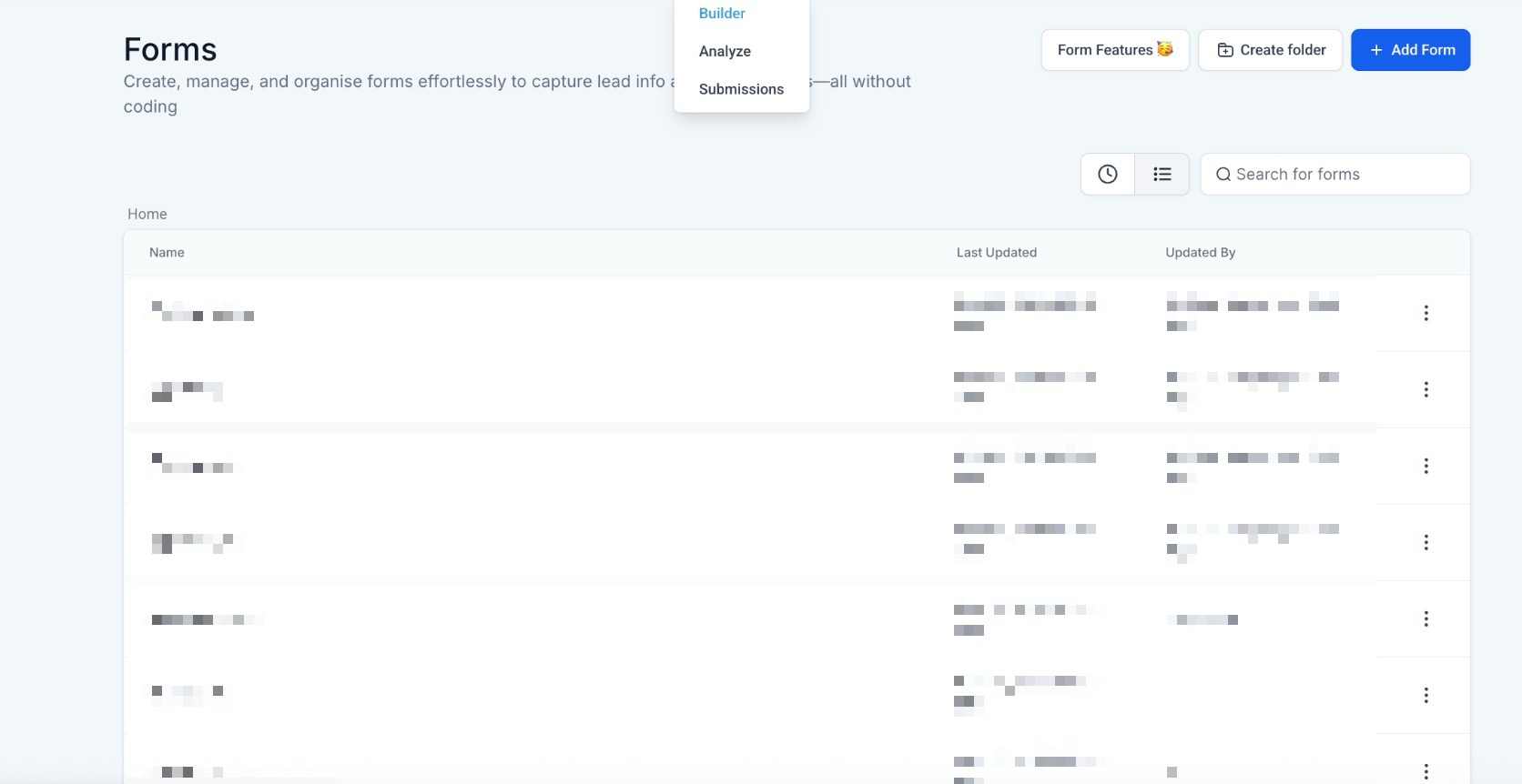 Go to Marketing & Sales Tab > Funnels and Pages on the left > Forms at the top. Here you’ll see 3 different options within the dropdown: Builder, Analyze, and Submissions.