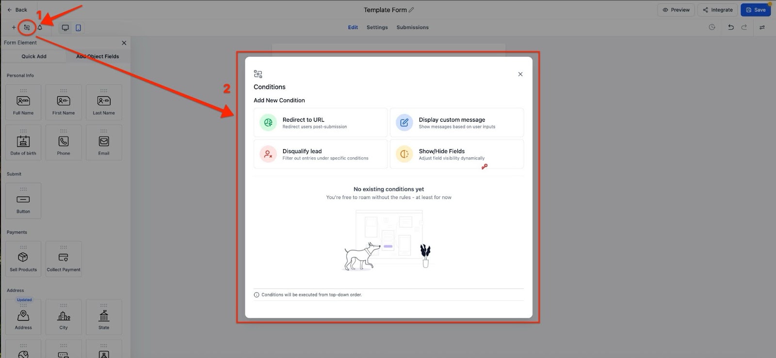 - Conditional logic takes precedence over on-submit actions such as redirecting to a URL or displaying a message. This ensures that the conditional rules you set are prioritized and followed.