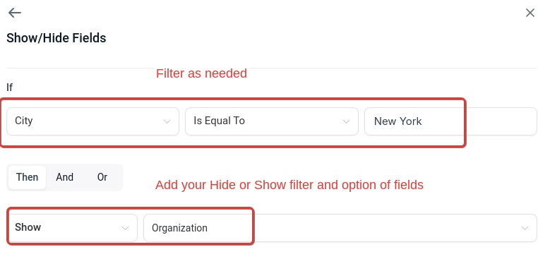 - With this option, your lead will not see the “hidden” field until they have met the criteria. In this example, if they write in the City “New York,” then the Organization field will show up.