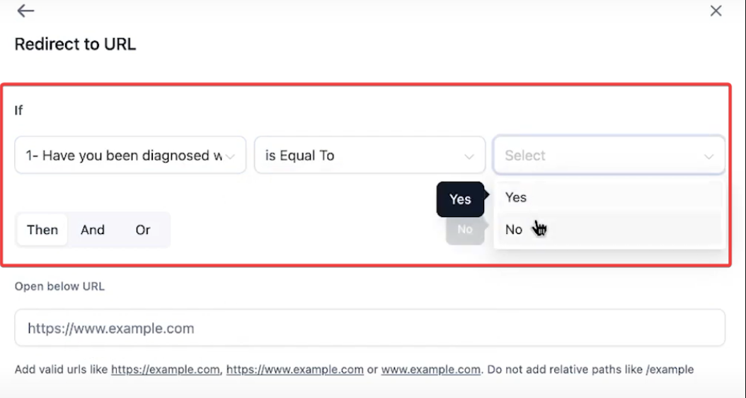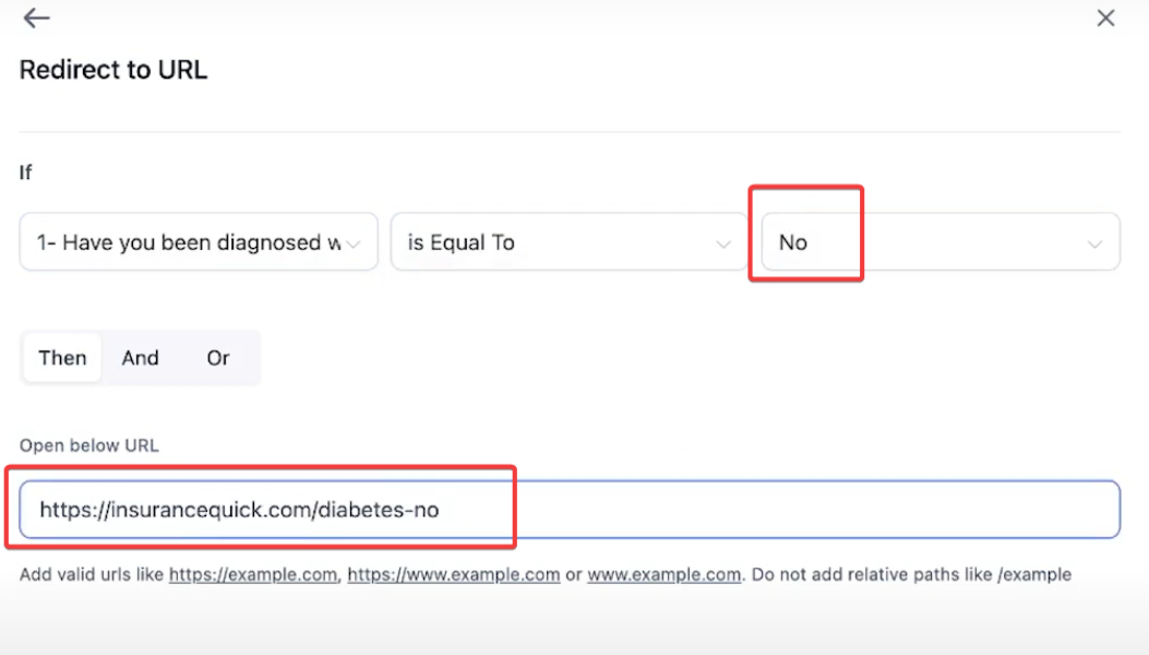 - Redirect URL: You can add a URL you want to send them to if they meet that logic. For example, you can filter by phone number and add a specific country code.
