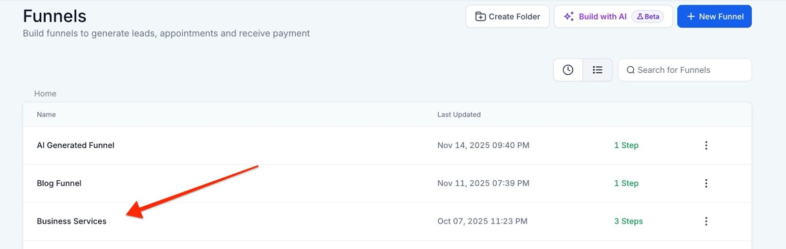 - Navigate to “Marketing & Sales” Tab > “Funnels and Pages” > "Funnels" or “Websites”> Open up your desired Funnel/Website
