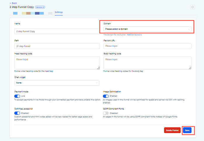 - Navigate to Funnels. Click into a funnel and choose “Settings”. Here you can select the domain for the funnel.