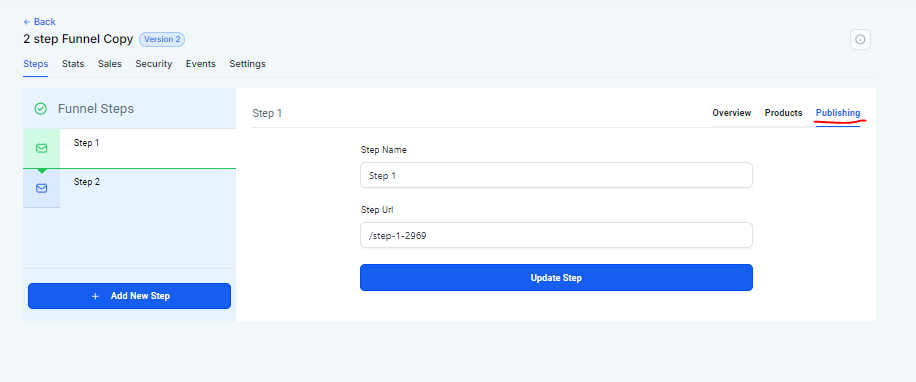 - Navigate to Funnels > Funnel Steps > Publishing.