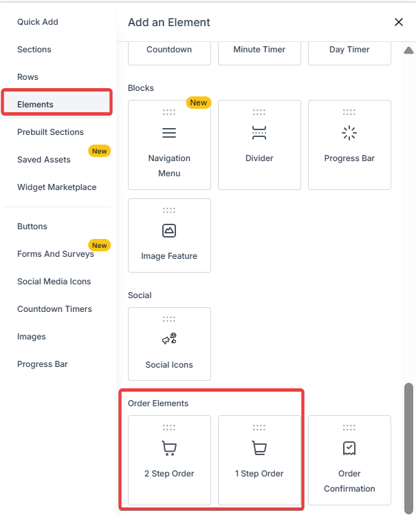 - In the builder, after adding the section and row you'll need to add an element. The element needs to be an order form.