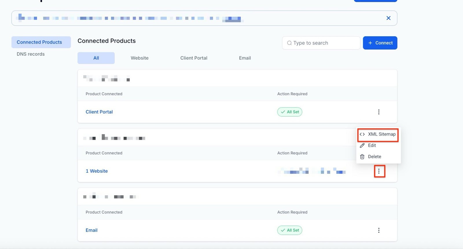 Once inside the XML Sitemap settings, you can view and manage the sitemaps for all connected websites and funnels associated with a domain. Here’s a breakdown of the available options: