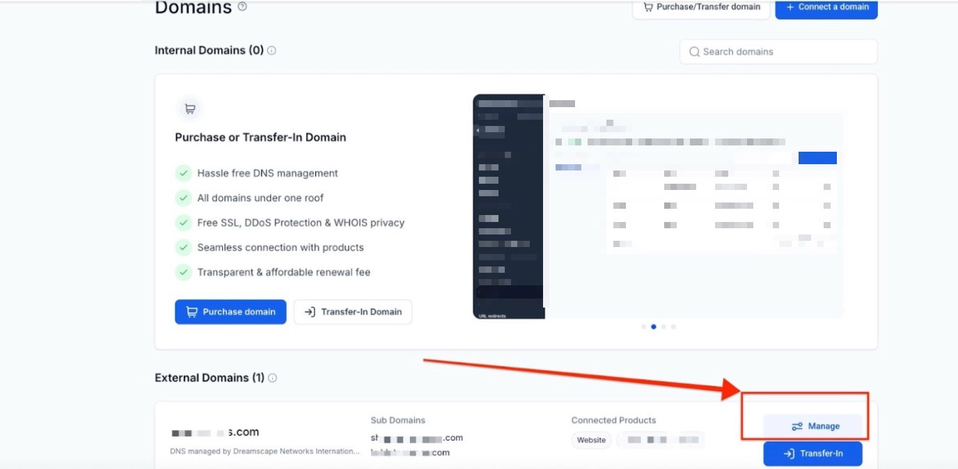 Once in the Domains section, select the “Manage” button of the relevant domain.