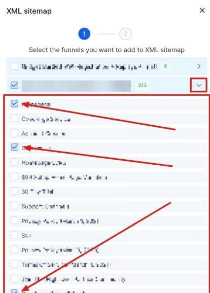 Select the website or funnel pages that you would like to add to your XML sitemap. You are allowed to connect many different websites and/or funnels to the same domain, so make sure you select all the pages you'd like added to your XML sitemap before proceeding.