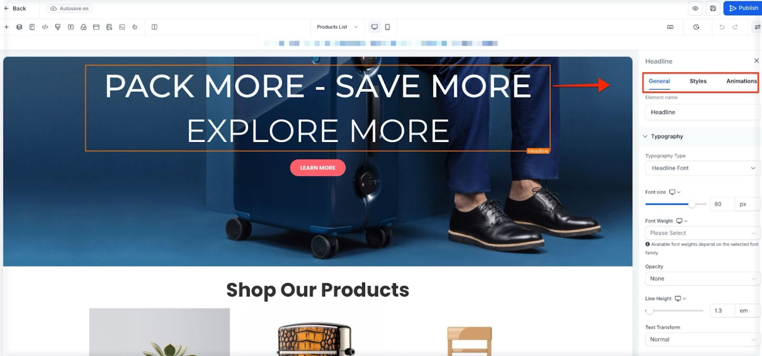- In the drag-and-drop Website Builder, there will be a menu at the left that allows you to drag sections, rows, columns, and elements onto the page. Then you can highlight elements (like the headline shown below) and use the new menu on the right to customize the font, spacing, alignment, hyperlinks, and more for that particular element.) Remember you have the ‘General’, ‘Animations’, and ‘Advanced’ tabs for all elements.