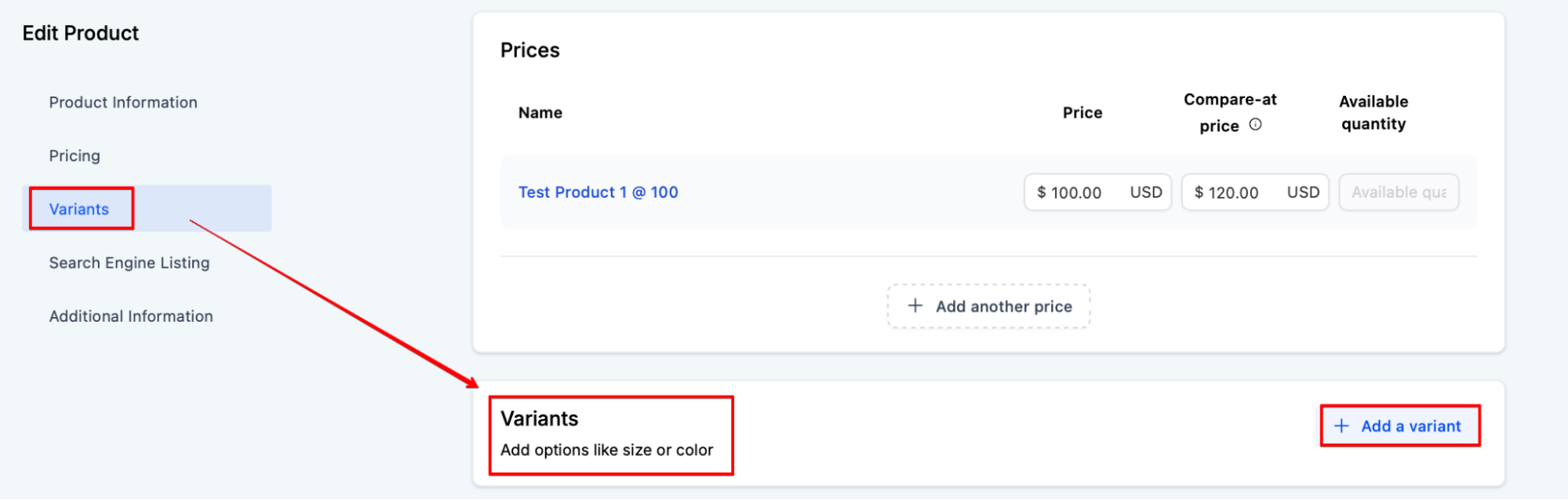 - Product Variants: To cater to a diverse customer base with varied needs and preferences, businesses can now add variants like size, color, or material to their product configurations. Each variant can also have its customized price point.