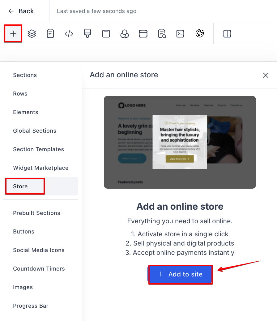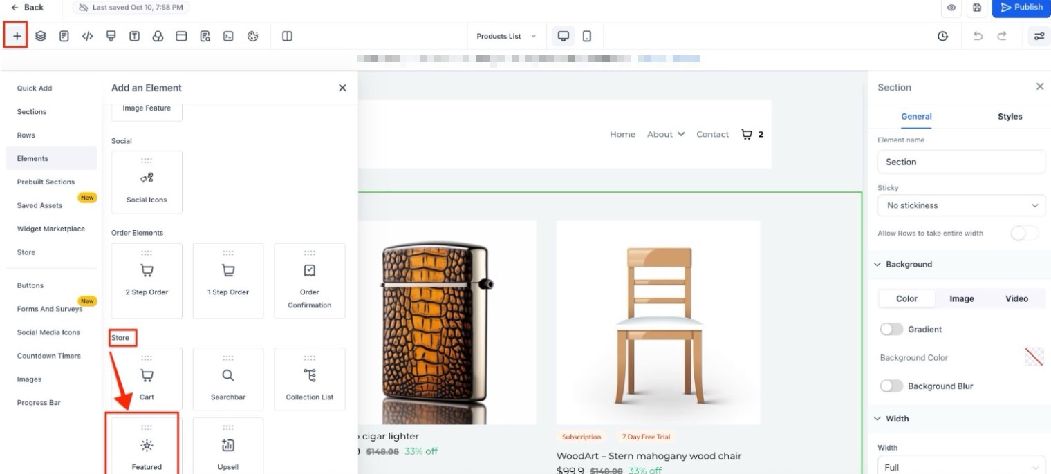 1- Go to the page builder, select "Add Element" → "Store" → "Featured Products".