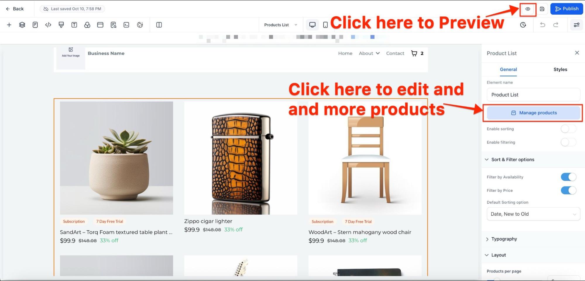 Please note: You will see the online store template element with photos and processes of different products, but they are part of the template. Once you preview the page, you will see your products.