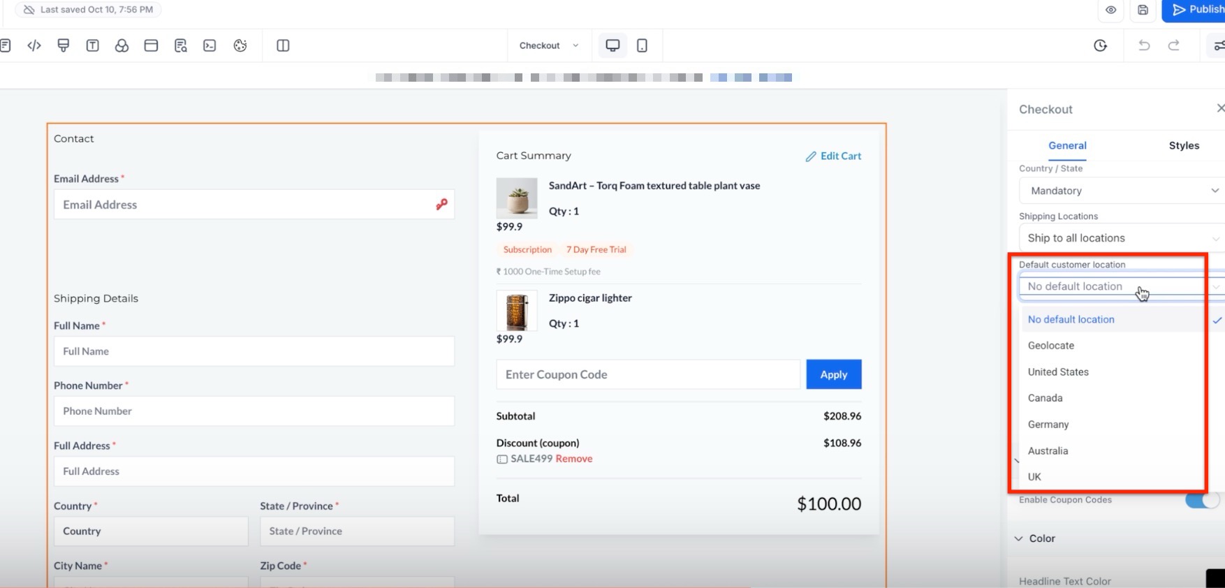 - Store owners can customize available shipping destinations on the checkout page and set default customer location preferences. Businesses can select specific countries for shipping or enable global shipping, while also simplifying the checkout process with geolocation for automatic location detection.